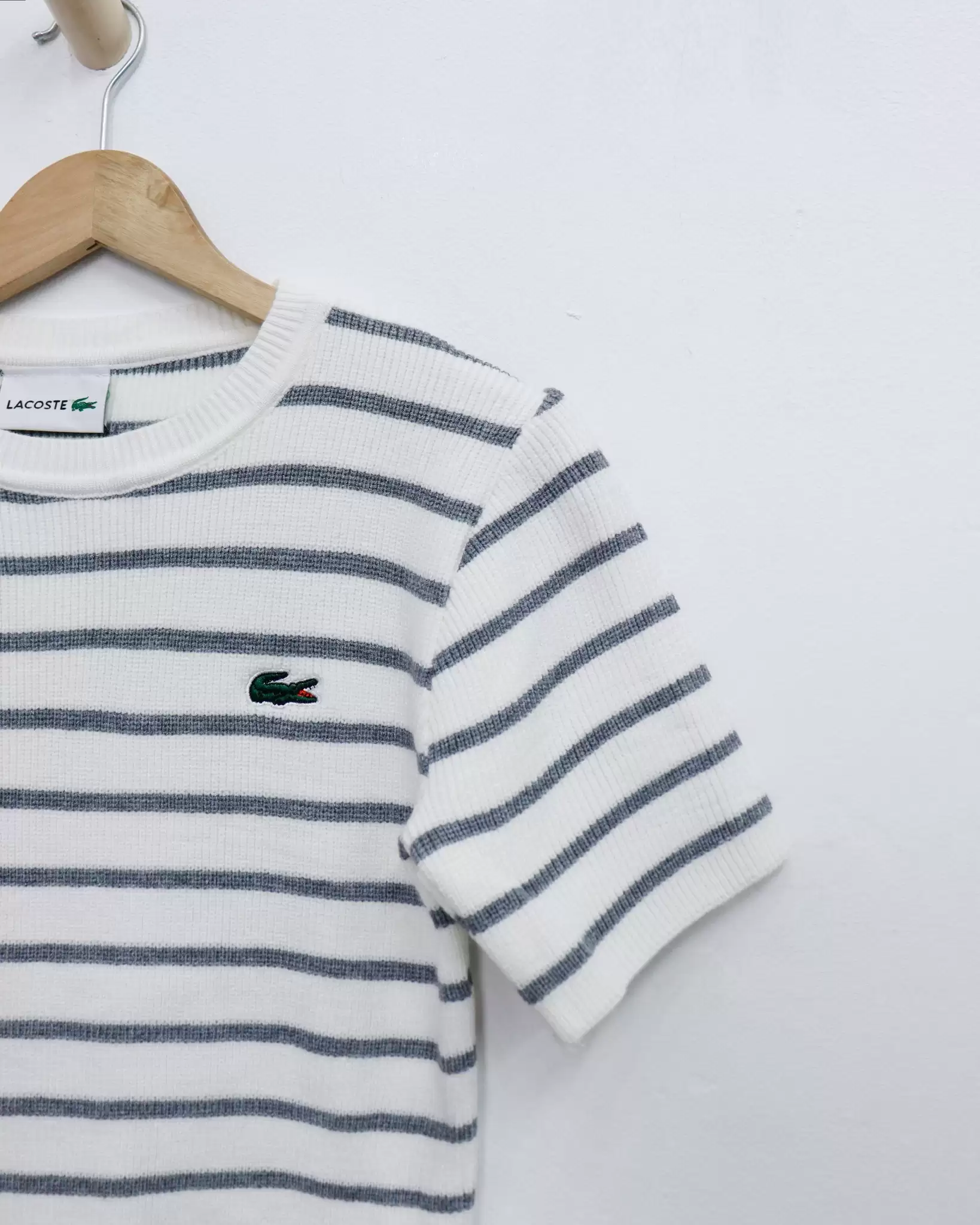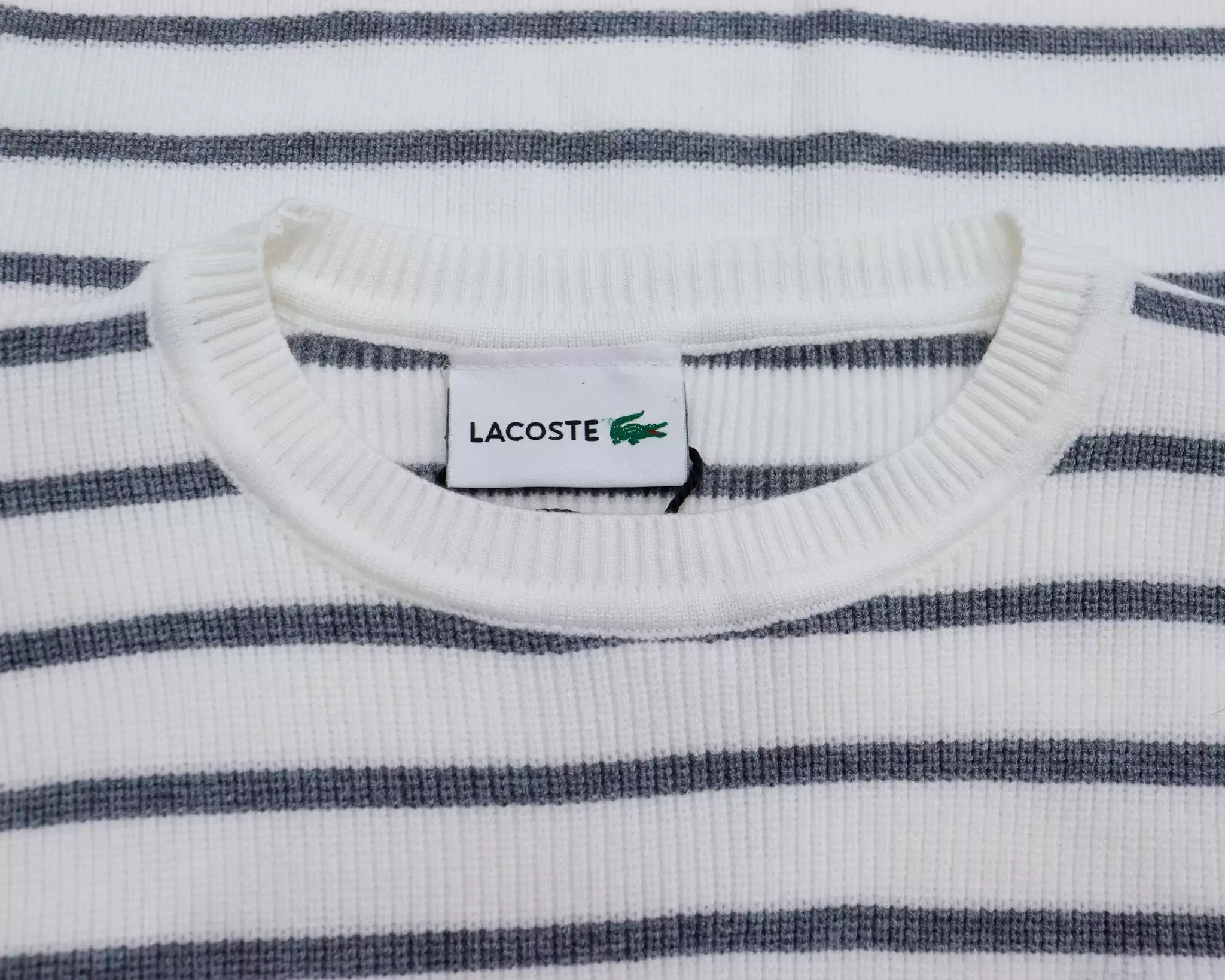 Áo len Lacoste cổ tròn, tay lỡ, sọc màu, thêu logo