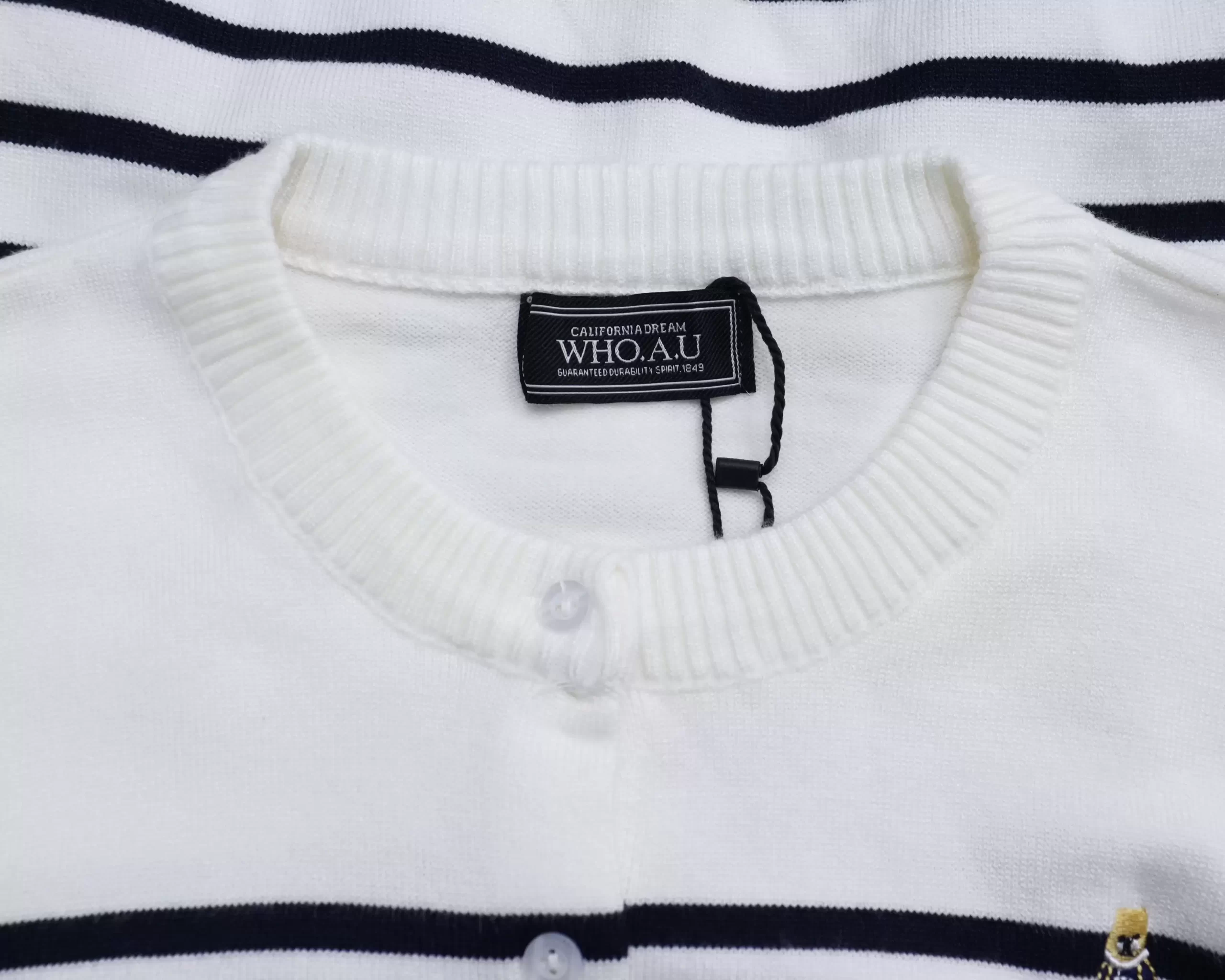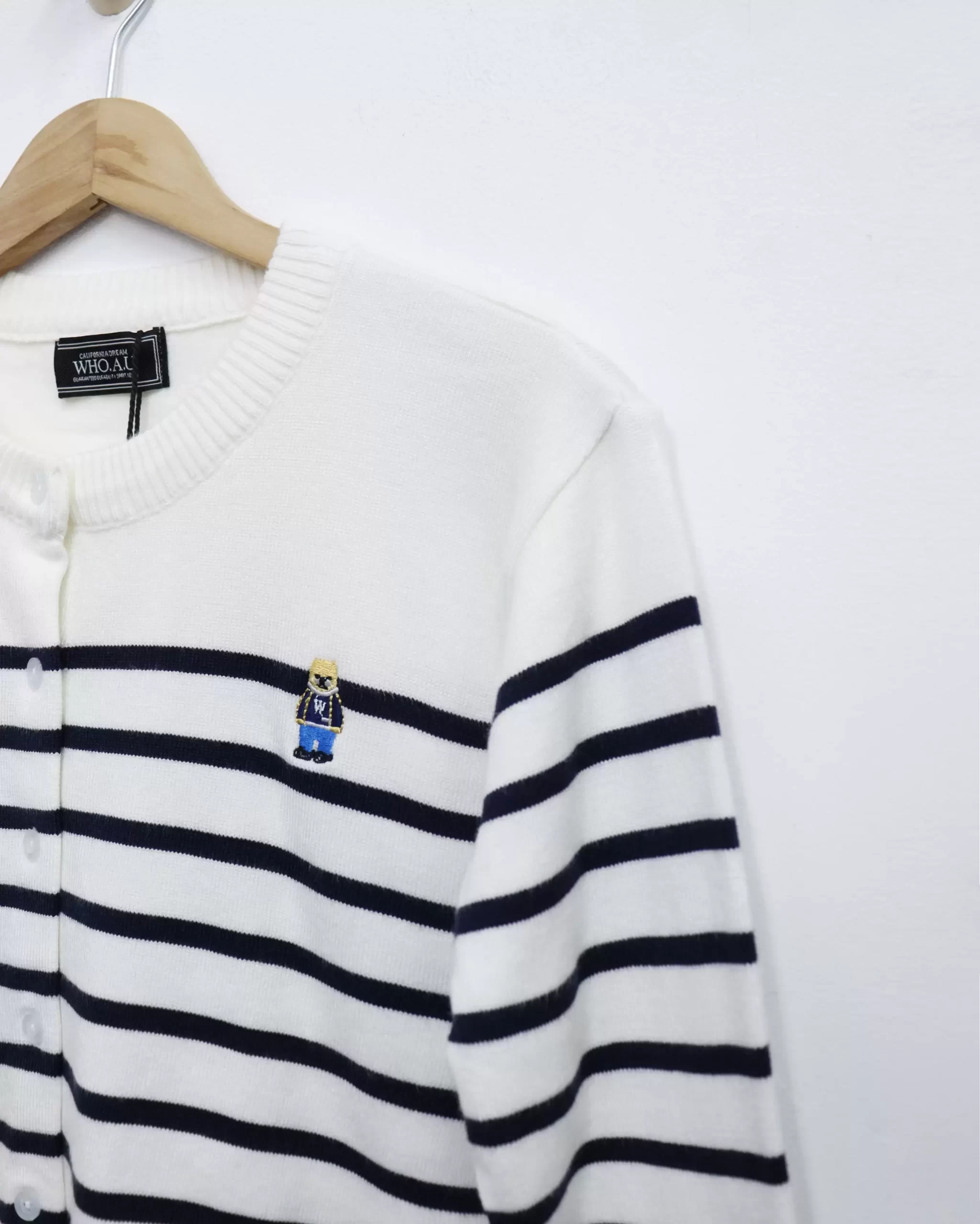 Áo Len WHO.A.U Cổ Tròn Tay Dài Sọc Ngang Cài Nút Thêu Gấu – Phong Cách Trẻ Trung, Dễ Thương