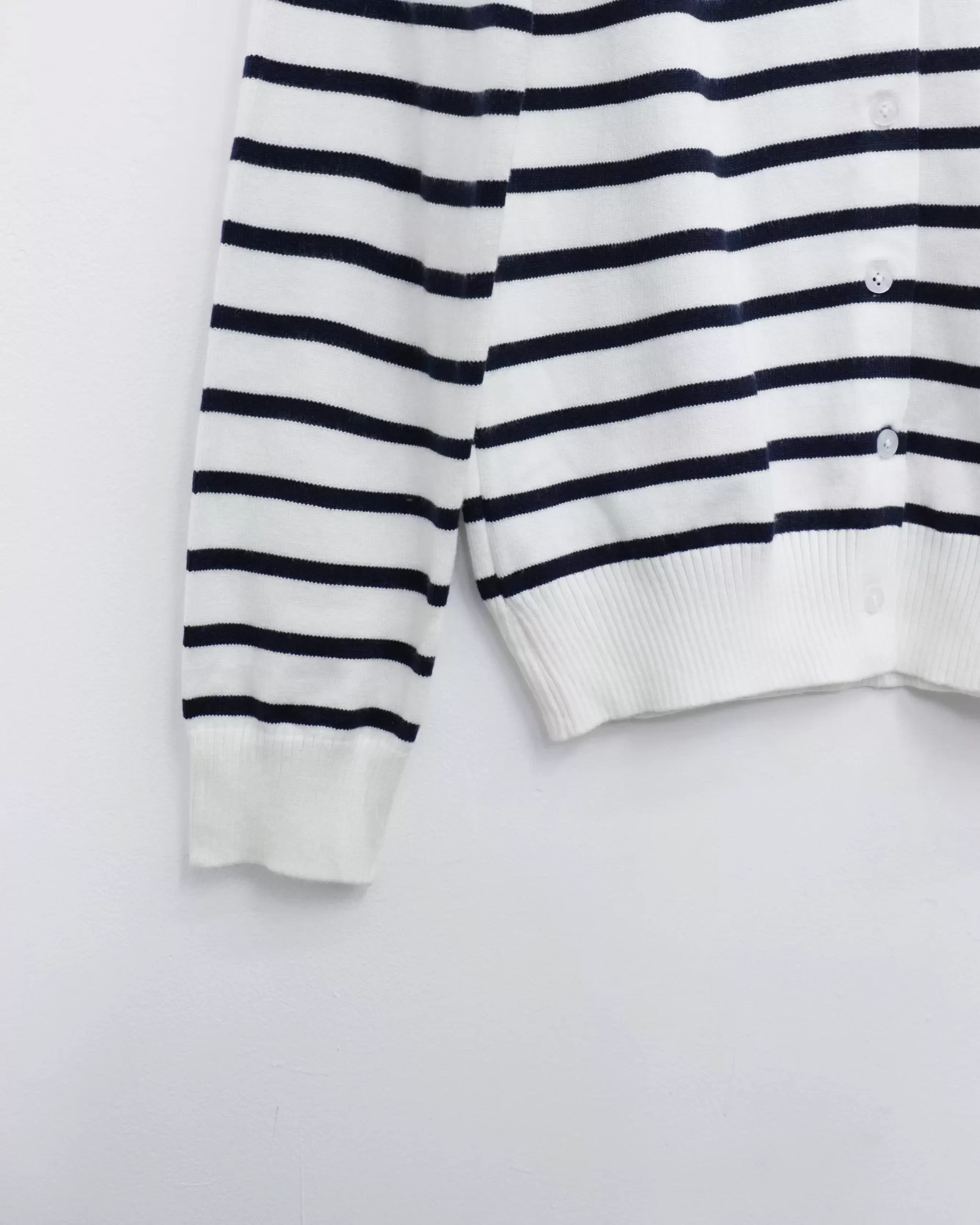 Áo len WHO AU cổ trogn tay dài sọc ngang cài nút thêu gấu